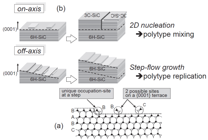 第一個突破性的里程碑是在1987年,日本的Kuroda等人和美國的Kong等人各自相繼提出了臺階流外延生長模型,在6H-SiC襯底上進行完美多型體復制,并給出了最優偏離晶向和偏角。