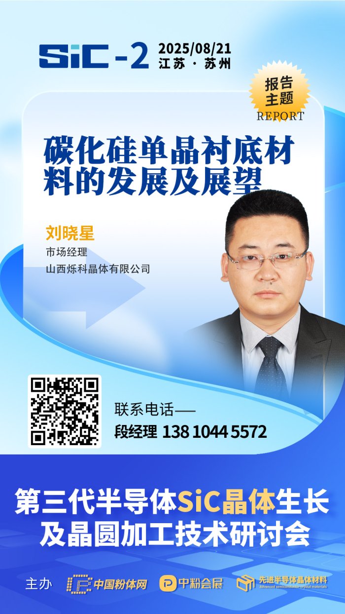 2025年8月21日,中國(guó)粉體網(wǎng)將在蘇州舉辦第三代半導(dǎo)體SiC晶體生長(zhǎng)及晶圓加工技術(shù)研討會(huì)。屆時(shí)山西爍科晶體有限公司市場(chǎng)經(jīng)理劉曉星將帶來(lái)《碳化硅單晶襯底材料的發(fā)展及展望》的精彩報(bào)告,共同探討碳化硅單晶襯底的發(fā)展現(xiàn)狀及未來(lái)趨勢(shì),歡迎報(bào)名參會(huì)!