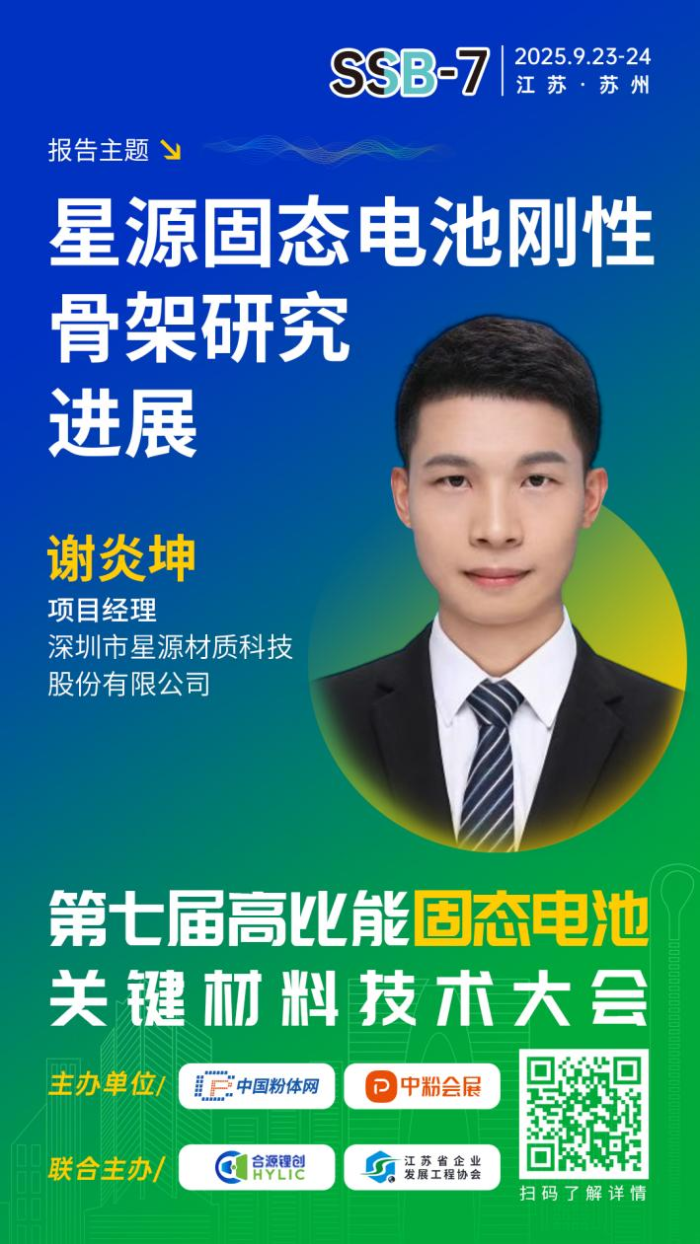 中國粉體網(wǎng)聯(lián)合合源鋰創(chuàng)、江蘇省企業(yè)發(fā)展工程協(xié)會,將于2025年9月23-24日在蘇州舉辦第七屆高比能固態(tài)電池關鍵材料技術大會。本次大會將聚焦固態(tài)電解質、正負極材料、界面工程、智能制造及產(chǎn)業(yè)化進展等熱點議題,深入探討固態(tài)電池的未來發(fā)展趨勢及挑戰(zhàn)。為致力于固態(tài)電池技術開發(fā)的企業(yè),科研院校,以及新能源汽車、儲能、消費電子等終端企業(yè)提供信息交流的平臺,開展產(chǎn)、學、研合作,助推固態(tài)電池產(chǎn)業(yè)化。屆時,深圳市星源材質科技股份有限公司謝炎坤博士將作題為《星源固態(tài)電池剛性骨架研究進展》的報告。