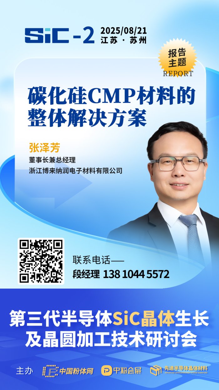 2025年8月21日,中國粉體網(wǎng)將在蘇州舉辦第三代半導(dǎo)體SiC晶體生長及晶圓加工技術(shù)研討會。我們邀請到浙江博來納潤電子材料有限公司董事長兼總經(jīng)理張澤芳并將帶來《碳化硅CMP材料的整體解決方案》的報告。屆時張總將詳細(xì)介紹博來納潤針對碳化硅半導(dǎo)體材料所提供的CMP材料整體解決方案,歡迎報名參會!
