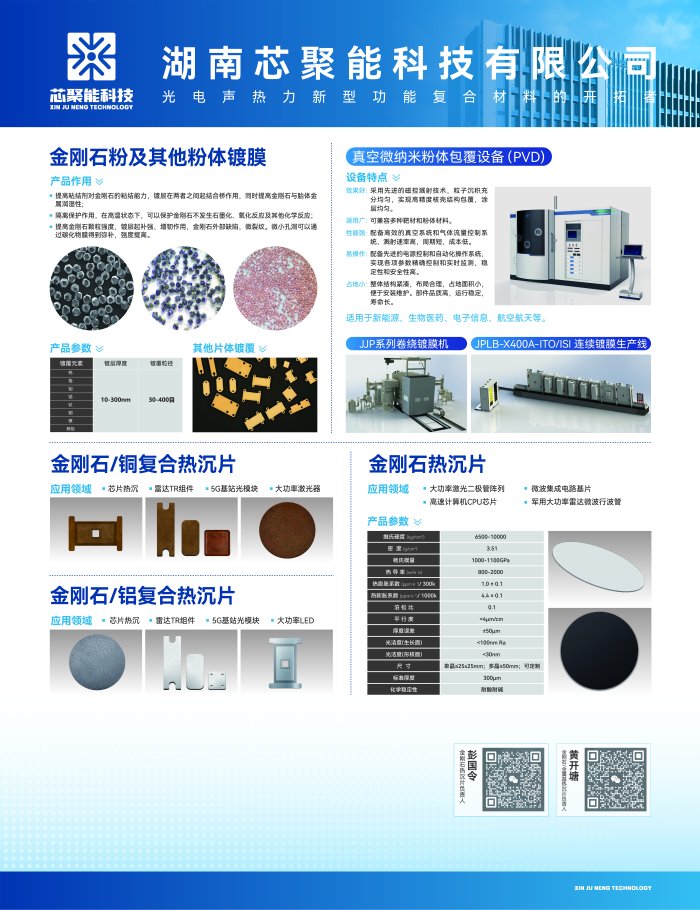 湖南芯聚能科技有限公司總部位于湖南長(zhǎng)沙,技術(shù)源起為中南大學(xué)氣相沉積技術(shù)與薄膜材料研究室(1999年成立,致力于光電聲熱力新型功能復(fù)合材料開(kāi)發(fā)20余年),是國(guó)內(nèi)*早開(kāi)展CVD金剛石和金屬基復(fù)合溫控材料研究的科研團(tuán)隊(duì)之一。針對(duì)國(guó)家重大科技創(chuàng)新需求和新一代電子元件散熱問(wèn)題,通過(guò)材料、工藝、技術(shù)及裝備多維度聯(lián)合,系統(tǒng)研究了CVD金剛石大面積高品質(zhì)制備工藝、導(dǎo)熱顆粒增強(qiáng)金屬基復(fù)合材料界面控制技術(shù)、多維度金剛石/金屬?gòu)?fù)合界面的設(shè)計(jì)理論及材料制備原理,形成了高性能復(fù)合溫控材料制備成型一體化技術(shù)以及低成本穩(wěn)定量產(chǎn)工藝,擁有國(guó)際先進(jìn)、國(guó)內(nèi)**的高性能溫控材料低成本、量化制備技術(shù)和成套生產(chǎn)裝備。