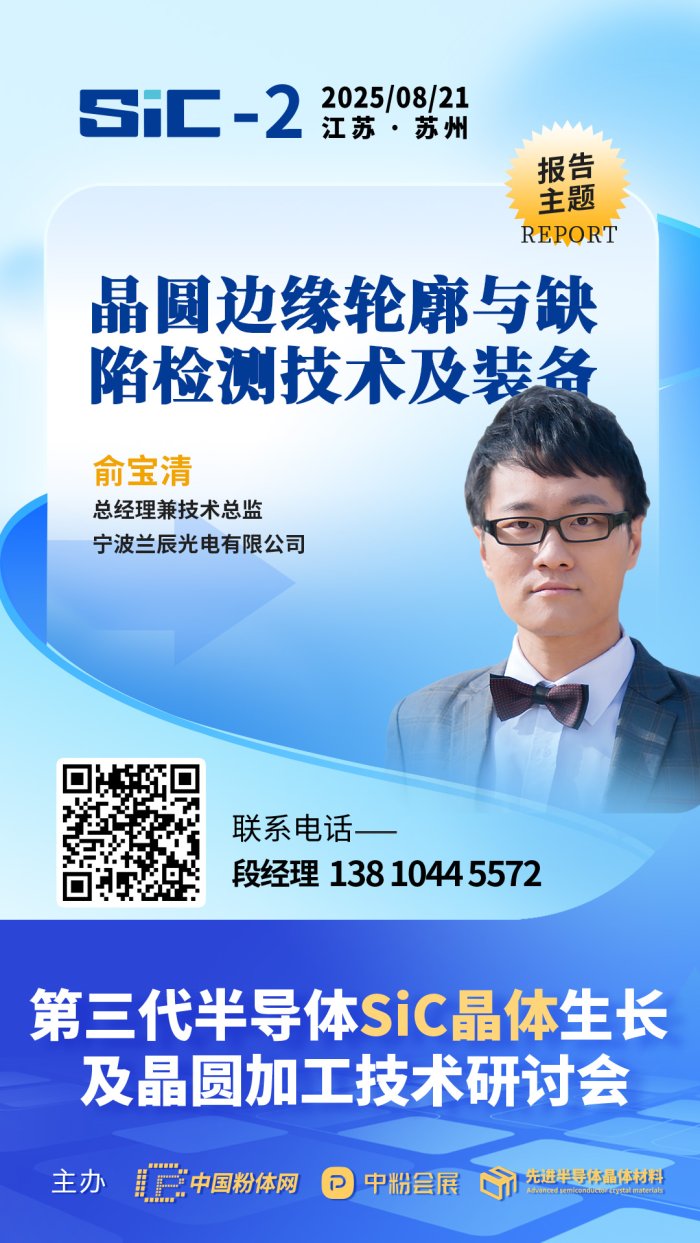 2025年8月21日,中國粉體網將在蘇州舉辦第三代半導體SiC晶體生長及晶圓加工技術研討會。屆時,來自寧波蘭辰光電有限公司總經理兼技術總監俞寶清將帶來《晶圓邊緣輪廓與缺陷檢測技術及裝備》的報告。帶你了解晶圓邊緣缺陷問題的解決方案。