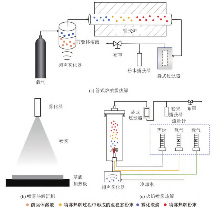 噴霧熱解設備主要由霧化器、加熱裝置和收集裝置組成。霧化器的主要功能是將前驅體溶液霧化成霧滴,根據前驅體溶液霧化方式的不同,霧化器可以分為超聲霧化器、氣動(壓力、雙液)霧化器和靜電霧化器。加熱裝置主要是對霧化液滴進行加熱,使其在加熱區發生熱解反應。根據加熱方式的不同,噴霧熱解可以分為管式爐噴霧熱解、噴霧熱解沉積和火焰噴霧熱解。收集裝置主要是對噴霧熱解后的固體粉末或薄膜樣品進行收集。