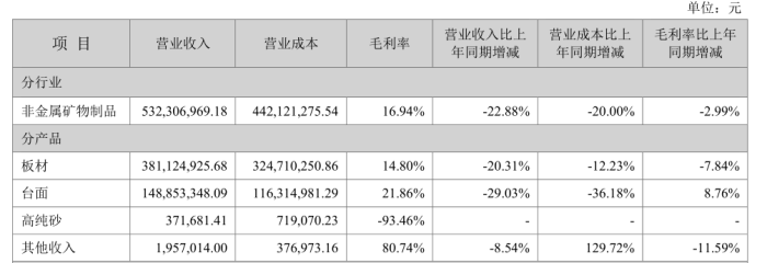 中旗新材2024年年度報告的數據也印證了高純砂業務的困境。報告顯示,公司全年實現營業收入5.32億元,同比下降22.88%;歸屬于上市公司股東的凈利潤為3051.15萬元。其中,高純砂業務表現尤為慘淡,營業收入僅為371,681.41元,而營業成本卻高達719,070.23元,毛利率低至-93.46%,陷入嚴重虧損狀態。