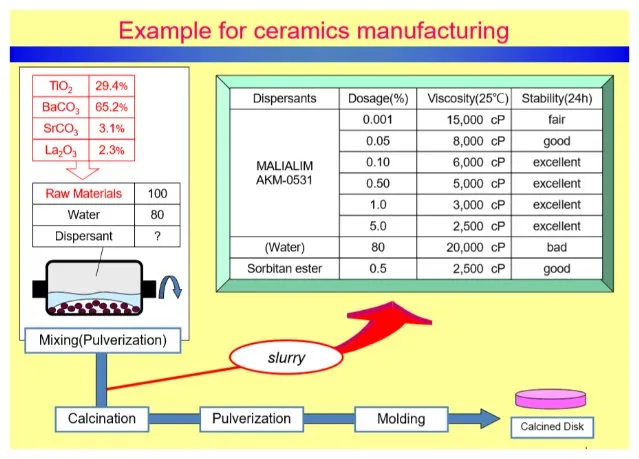 由于CE64是液體的,因此可以完全與陶瓷漿料混合分散,在加到漿料中后可以立即達到解凝效果,因此CE64可以在任何時候在攪拌過程加入去調節漿料粘度,能使漿料達到很均一的分散和降粘效果。