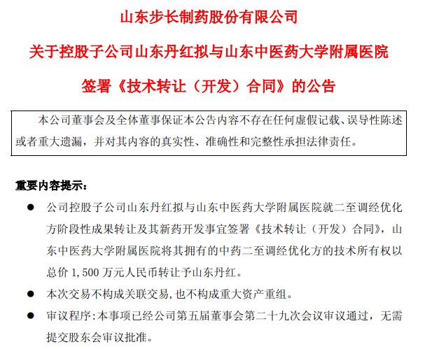 山東中醫(yī)藥大學(xué)附屬醫(yī)院將其擁有的中藥二至調(diào)經(jīng)優(yōu)化方的技術(shù)所有權(quán)以總價(jià)1500萬(wàn)元人民幣轉(zhuǎn)讓予山東丹紅,雙方將依據(jù)合同中所約定的責(zé)任和義務(wù),遵循《藥品注冊(cè)管理辦法》和《中藥注冊(cè)管理專門規(guī)定》及相關(guān)要求,開(kāi)展中藥新藥研究,并實(shí)現(xiàn)該新藥的工業(yè)化規(guī)模生產(chǎn)。