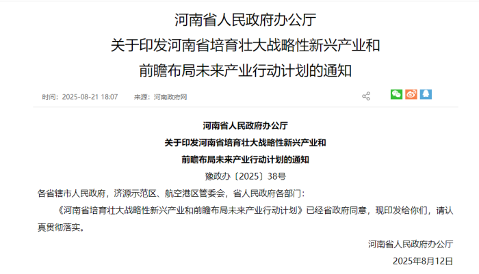 中國粉體網訊 8月21日,河南省人民政府辦公廳印發《河南省培育壯大戰略性新興產業和前瞻布局未來產業行動計劃》,計劃提出,到2027年,全省戰略性新興產業增加值年均增長11%以上,占規模以上工業增加值比重超過27%,未來產業體系加快構建,形成未來產業與戰略性新興產業梯次接續發展格局。布局50個左右省級以上研發創新平臺,突破50項前沿引領技術和關鍵核心技術,培育50家左右具有產業生態主導力的龍頭企業,打造100個典型應用場景,建設8個左右國家級戰略性新興產業集群和國家先進制造業集群。