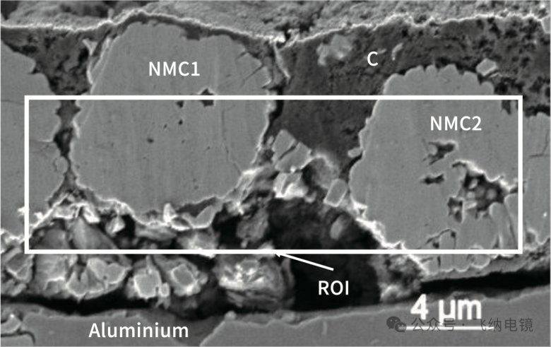 觀察了經氬離子束拋光的固態電池(SSB)陰極顆粒的橫截面。該未氧化的樣品由被導電碳添加劑包圍的鎳錳鈷(NMC)顆粒組成。該涂層被涂覆在鋁箔上。涂層厚度為 10 微米。該涂層從鋁箔上脫離。然而,未觀察到 NMC1 和 NMC2 顆粒之間存在結構差異。