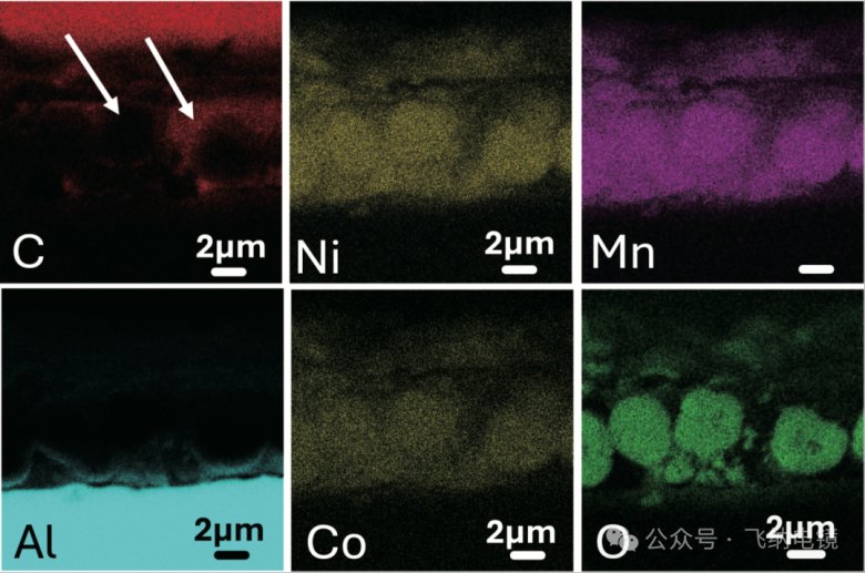 在相同的感興趣區域(ROI)進行了EDS元素分析。鎳(Ni)、錳(Mn)、鈷(Co)和氧(O)的分布驗證了顆粒的相同元素結構。鋁(Al)的分布證實了與鋁箔的類似接觸。然而,碳(C)分布顯示 NMC1 與添加劑之間缺乏可靠的接觸。因此,推斷碳添加劑的缺失是接觸失效的根源。