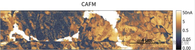 在相同的感興趣區域(ROI)進行了 CAFM 電流測量。碳添加劑的導電性最高。因此,觀察到顆粒之間的導電性差異。這證明了顆粒接觸損失的發生。NMC1 的中位電流 Imedian = 0.05nA,而 NMC2 的中位電流 Imedian = 0.51nA。由于使用了 8V 的探針偏壓,電阻差異計算為 17.4G。