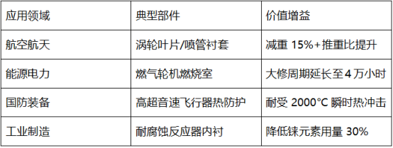 這些特性使其成為燃氣輪機葉片、燃燒室襯套、火箭噴管等熱端部件的理想材料。通過增材制造技術,工程師現在可自由設計復雜冷卻通道、薄壁結構等傳統鑄造無法實現的幾何構型,顯著提升部件壽命與效率。