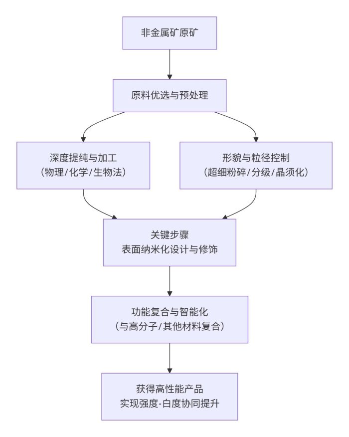 非金屬礦強(qiáng)度-白度的協(xié)同提升已不再是孤立的技術(shù)改進(jìn),而是一個(gè)貫穿礦物精選、超微粉碎、表面化學(xué)、復(fù)合材料設(shè)計(jì)與智能制造的系統(tǒng)性工程。其核心趨勢(shì)是從被動(dòng)除雜轉(zhuǎn)向主動(dòng)構(gòu)建,通過設(shè)計(jì)多功能的復(fù)合顆粒結(jié)構(gòu),并借助智能化工藝精準(zhǔn)控制,最終實(shí)現(xiàn)在不犧牲任何一方性能的前提下,甚至賦予新材料更多功能,同步提升其力學(xué)性能和光學(xué)性能。這一趨勢(shì)極大地提升了非金屬礦產(chǎn)品的附加值和技術(shù)壁壘。