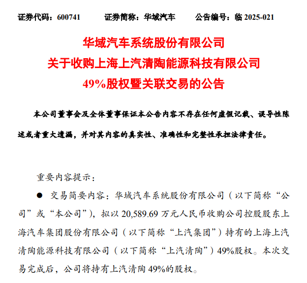 中國粉體網訊 8月27日,華域汽車系統股份有限公司(簡稱:華域汽車)發布公告稱,擬以20589.69萬元人民幣收購公司控股股東上海汽車集團股份有限公司(簡稱:上汽集團)持有的上海上汽清陶能源科技有限公司(簡稱:上汽清陶)49%股權。本次交易完成后,華域汽車將持有上汽清陶49%的股權。