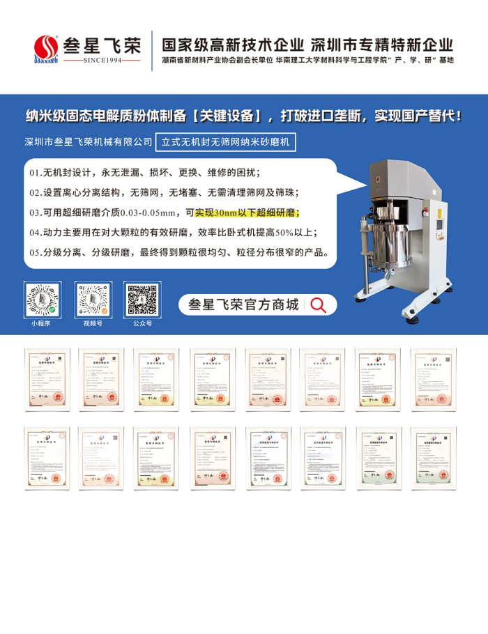 深圳市叁星飛榮機(jī)械有限公司始建于1994年,是一家為全球材料生產(chǎn)企業(yè)和科研機(jī)構(gòu)提供粉體制備智能生產(chǎn)解決方案和砂磨機(jī)設(shè)備的國(guó)家級(jí)高新技術(shù)企業(yè)。