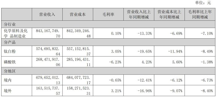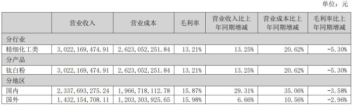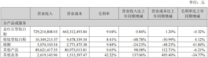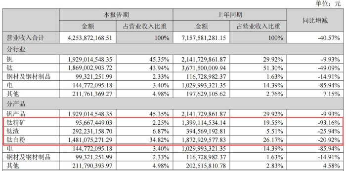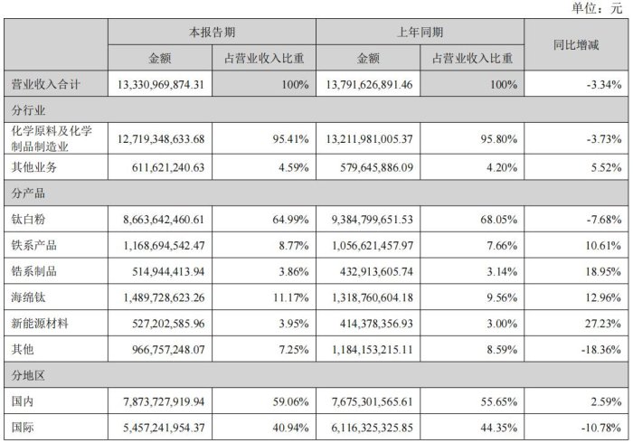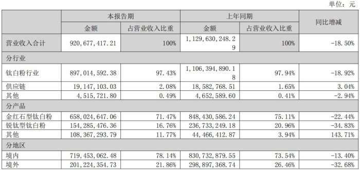 報(bào)告期內(nèi),鈦精礦營(yíng)收95,667,449.03元,同比減少93.16%,鈦白粉營(yíng)收1,481,075,271.29元,同比減少20.92%。