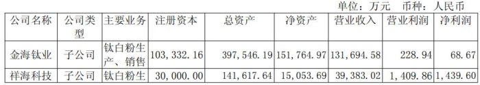 公司全資子公司金海鈦業(yè)和祥海科技共同組成公司鈦白粉業(yè)務(wù)板塊。其中,金海鈦業(yè)擁有年產(chǎn)超20萬(wàn)噸的硫酸法鈦白粉生產(chǎn)線,報(bào)告期內(nèi)鈦白粉營(yíng)收131,694.58萬(wàn)元,營(yíng)業(yè)利潤(rùn)228.94萬(wàn)元。祥海科技目前擁有年產(chǎn)6萬(wàn)噸氯化法鈦白粉生產(chǎn)線,營(yíng)業(yè)收入39,383.02萬(wàn)元,營(yíng)業(yè)利潤(rùn)1,409.86萬(wàn)元。