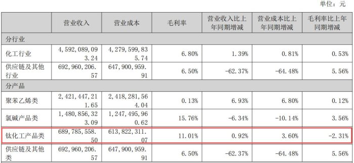 報(bào)告期內(nèi),天原股份鈦化工產(chǎn)品營(yíng)收689,785,558.50元,同比增加0.92%,毛利率減少2.31%。