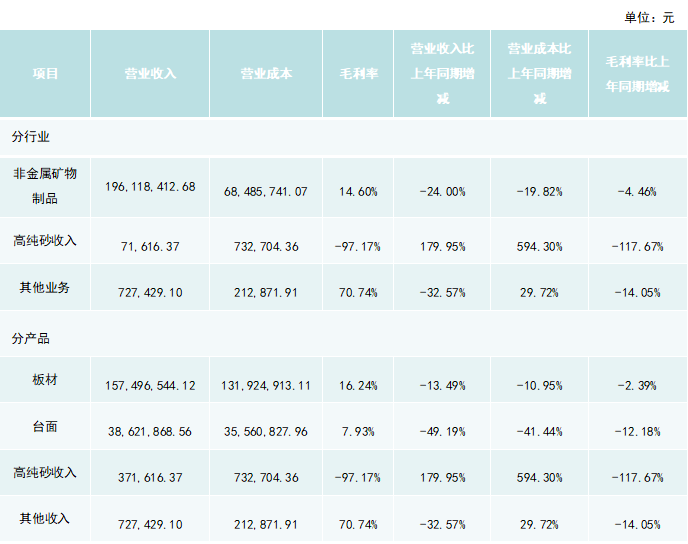 2025年上半年,中旗新材營收1.97億元(同比降23.93%),凈利252.3萬元(同比降89.35%);核心產(chǎn)品中,人造石英石板材營收1.57億元(降13.49%,毛利率16.24%)、臺(tái)面0.39億元(降49.19%,毛利率7.93%),高純石英砂營收37.2萬元(增179.95%,毛利率-97.17%)。