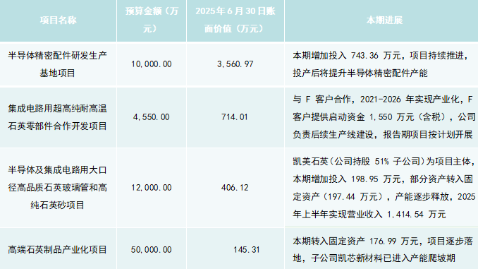 在建項(xiàng)目推進(jìn)順利,半導(dǎo)體精密配件研發(fā)生產(chǎn)基地等4大項(xiàng)目總預(yù)算7.655億元,凱美石英石英砂項(xiàng)目實(shí)現(xiàn)營收1414.54萬元。