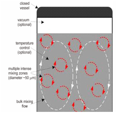 RAM技術(shù)含有一個能產(chǎn)生聲能場的共振機(jī)械專有驅(qū)動器,機(jī)械系統(tǒng)的共振會將低頻共振聲波能量引入到混合矩陣中(可以是固-固、固-液、液-液和液-氣的混合,圖中的紅色圈流),聲波在整個混合矩陣中的傳播會形成大混合區(qū)(圖中的白色圈流),也稱為體聲流;這樣在整個混合介質(zhì)中形成了微尺度渦流(微聲流)和局部混合(體聲流)。這種聲共振混合的實現(xiàn)需要專有和獨特的控制技術(shù),通過有效載荷中的聲壓波傳播,將系統(tǒng)的機(jī)械能高效地傳遞到混合容器的材料中。