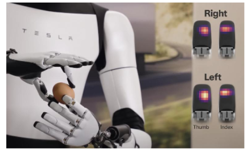在應用場景方面,目前電子皮膚在人形機器人中主要集中于手部,觸覺傳感器可輔助靈巧手在執行精細任務時實現精準力控,以特斯拉二代靈巧手為例,其每個指尖都配備了觸覺傳感器,當手指接觸雞蛋時,觸覺傳感器能實時反饋信息,使靈巧手施加適當力度,同時機器人大腦會根據反饋向執行機構下達加力、減力的命令,確保每一步操作都精準無誤。