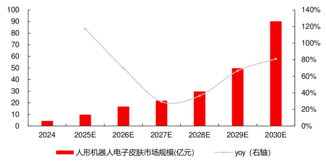 市場規模方面,隨著人形機器人量產進程加快以及電子皮膚單臺用量的增加,其市場規模將迎來爆發式增長,當前電子皮膚應用尚處于起步階段,2024年人形機器人電子皮膚市場規模僅為4.6億元。但未來隨著人形機器人產量的飛速提升,以及量產后各廠商對電子皮膚重視程度的不斷提高,電子皮膚市場需求將持續增長。相關機構預計到2030年,人形機器人電子皮膚市場規模將達到90.5億元,復合年增長率(CAGR)高達64.3%,若遠期人形機器人實現百萬臺銷量,電子皮膚市場規模有望突破1560億元,展現出巨大的市場潛力。
