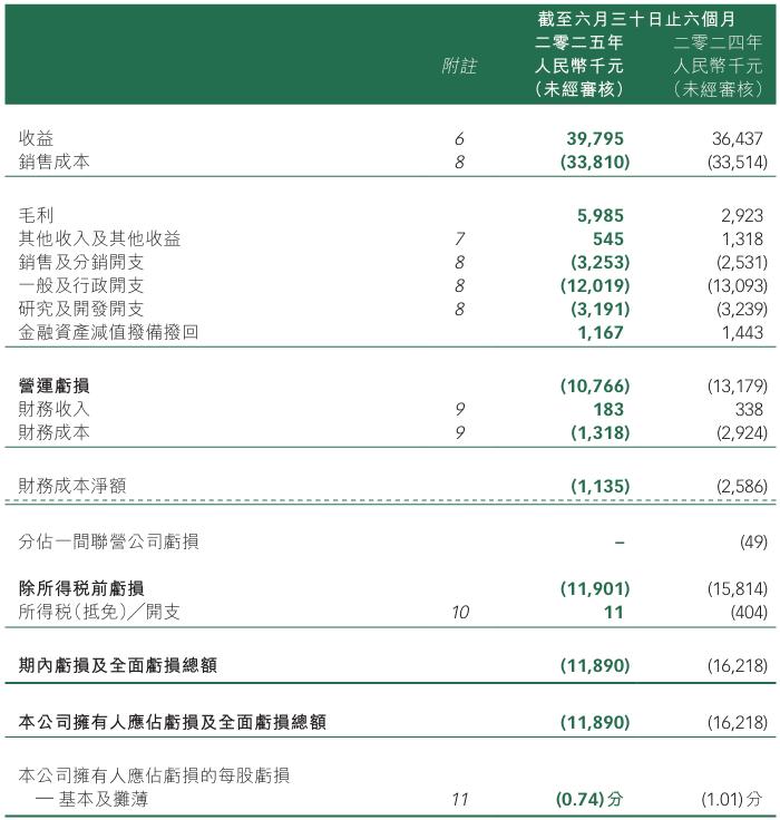 2025年上半年及2024年上半年的除稅后虧損分別約為人民幣11.9百萬元及人民幣16.2百萬元。