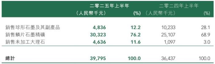 2025年上半年及2024年上半年,銷售鱗片石墨精礦所產(chǎn)生收益分別占總收益的約76.2%及68.9%。