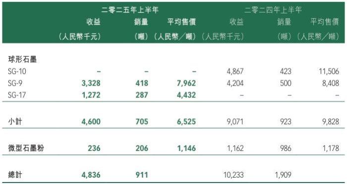 2025年上半年及2024年上半年,銷售球形石墨所得收益分別占總收益的約12.2%及28.1%。