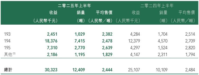 2025年上半年及2024年上半年,鱗片石墨精礦主要銷售類型為「193」(碳含量為93%或介乎93%至低于94%)、「194」(碳含量為94%或介乎94%至低于95%)及「195」(碳含量為95%或介乎95%至低于96%)。