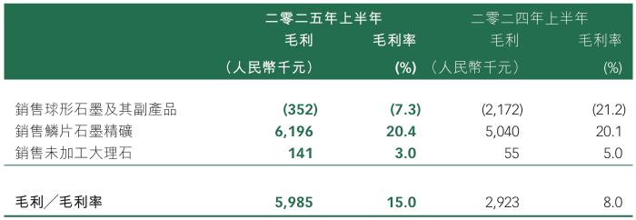 銷售球形石墨及其副產(chǎn)品的毛損及毛損率于2025年上半年約為人民幣0.4百萬元及7.3%,而2024年上半年的毛損及毛損率則約為人民幣2.2百萬元及21.2%。