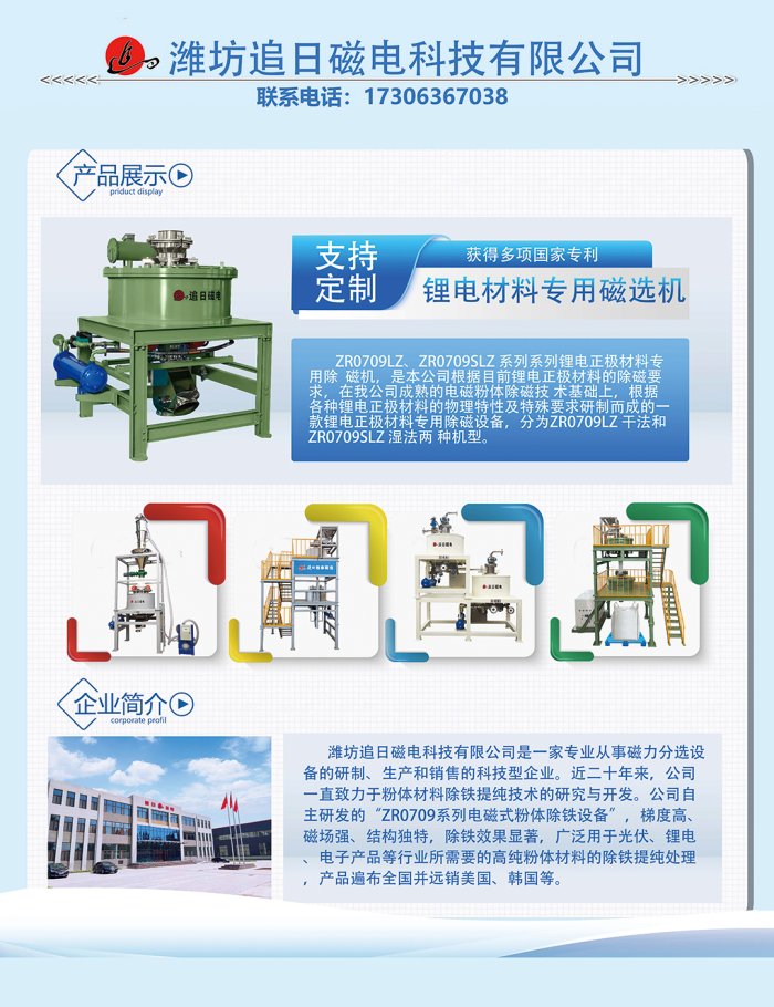 濰坊追日磁電科技有限公司是一家專業從事磁力分選設備的研制、生產和銷售的科技型企業。近二十年來,公司一直致力于粉體材料除鐵提純技術的研究與開發。公司自主研發的“ZR0709系列電磁式粉體除鐵設備”,梯度高、磁場強、結構獨特,除鐵效果顯著,廣泛用于光伏、鋰電、電子產品等行業所需要的高純粉體材料的除鐵提純處理,產品遍布全國并遠銷美國、韓國等。