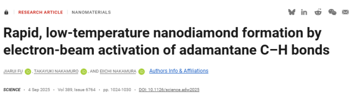 東京大學(xué)Eiichi Nakamura教授聯(lián)合Takayuki Nakamuro教授首次利用電子束照射金剛烷微晶,在低溫、真空環(huán)境下,幾十秒內(nèi)就能生成無缺陷的立方相納米金剛石。相比傳統(tǒng)高溫高壓法,這一方法不僅條件溫和,還能直觀追蹤反應(yīng)過程,揭示金剛石形成的化學(xué)機制。相關(guān)成果以“Rapid,low-temperature nanodiamond formation by electron-beam activation of adamantane C-H bonds”為題發(fā)表在《Science》上。