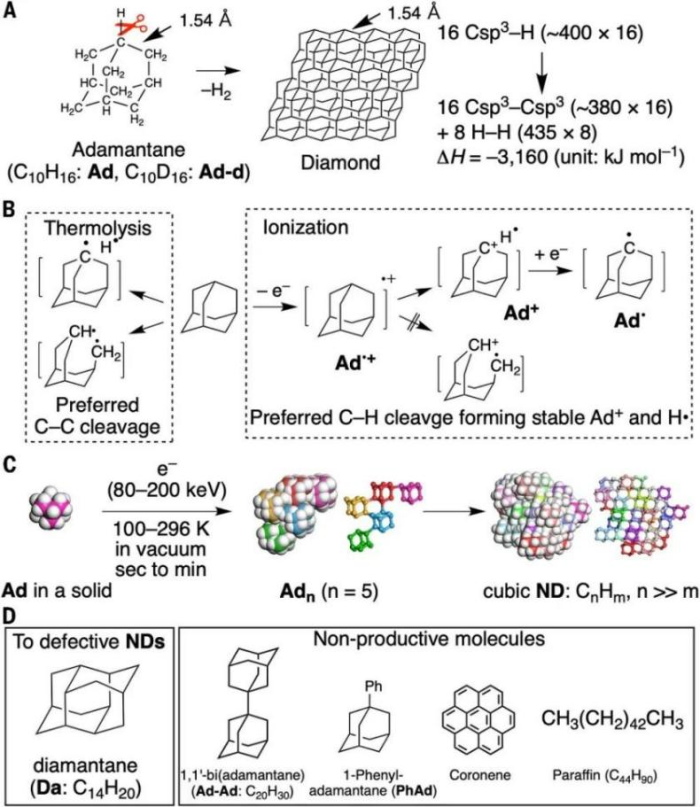研究團隊利用高能電子束在真空低溫中轟擊金剛烷微晶,激發(fā)分子發(fā)生電離和斷鍵反應(yīng)。透射電子顯微鏡的實時成像顯示,金剛烷先形成低聚物(Adn),再逐步轉(zhuǎn)化為球形納米金剛石。與此同時,氫氣大量釋放,印證了C-H鍵裂解在其中起到了關(guān)鍵作用。進一步的對比實驗也表明,只有具有四面體對稱骨架的金剛烷最適合作為“積木”,而其他結(jié)構(gòu)如二金剛烷、苯基金剛烷或石蠟在相同條件下均無法生成納米金剛石。