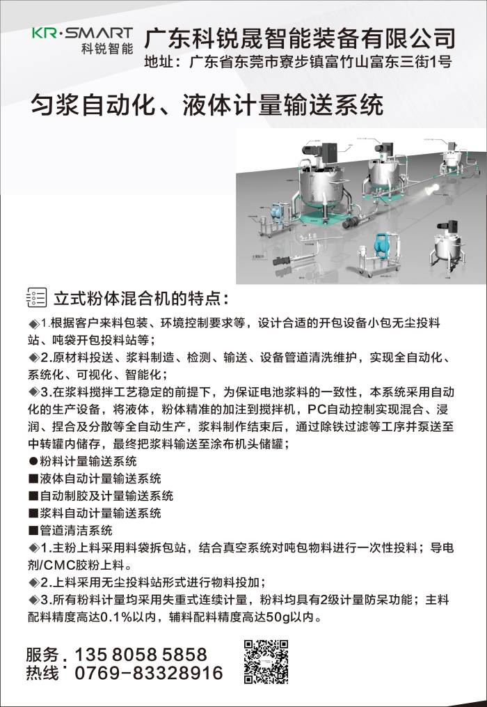 科銳創始于2006年,歷經多年穩健發展,在2025年榮耀升級,正式蛻變成為廣東科銳晟智能裝備有限公司。總部位于廣東省東莞市寮步鎮,是一家集研發、生產、銷售、服務于一體的新能源鋰電裝備國家級高新技術企業。公司以高粘度攪拌、干燥、研磨、分散及智能化輸送系統為核心技術,產品覆蓋鋰電軟體工程全領域,包含智能動力攪拌機、真空干燥機、砂磨機等,還提供MES系統及物流輸送系統。我們為客戶提供物料處理自動化一站式解決方案,從拆包投料、物料存儲到智能控制,全流程覆蓋。公司產品廣泛應用于新能源行業、復合材料、膠黏劑、醫藥、日化、食品、涂料、5G材料、半導體材料等多個領域,滿足各類個性化定制需求。