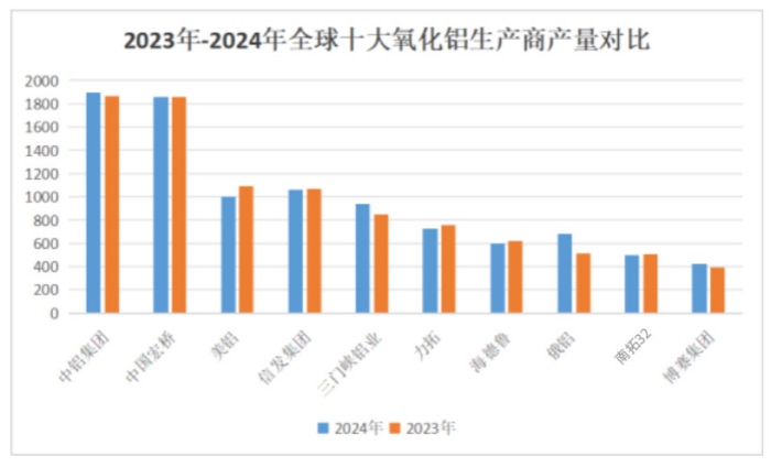 阿拉丁(ALD)統計數據顯示,2024年全球十大氧化鋁生產商合計產量約為9694萬噸,同比上漲2.86%。從集團數量看,中外企業各占五席,其中五家中國企業集團分別是中鋁集團、中國宏橋、信發集團、三門峽鋁業和博賽集團,合計產量約為6182萬噸,占比為63.77%。