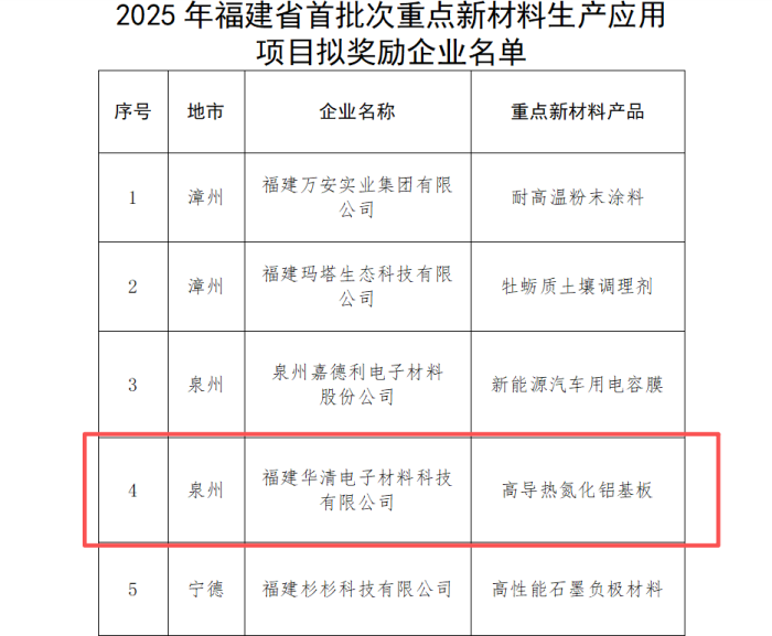 中國粉體網(wǎng)訊 近日,福建省工信廳公示2025年福建省首批次重點新材料生產(chǎn)應用項目擬獎勵企業(yè)名單,福建華清電子材料科技有限公司入選。