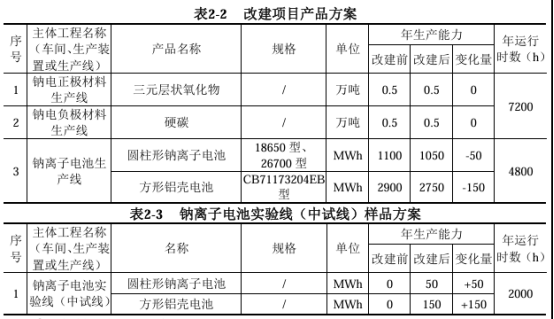 該項目總投資3700萬元,改建后年產18650型、26700型圓柱鈉電池1050MWh,方形鋁殼鈉電池年產能2750MWh;鈉離子電池實驗線(中試線)年產圓柱鈉電池50MWh、方形鋁殼電池150MWh;還將改造三元層狀氧化物正極材料產能5000噸,硬碳負極材料產能5000噸。