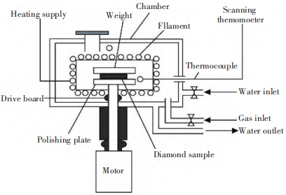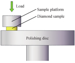 機械拋光是利用金剛石與高速旋轉的拋光盤(鑄鐵盤、砂輪盤)相互摩擦產生脆性斷裂去除表面材料的拋光工藝,同時,由于高速旋轉的拋光盤與金剛石摩擦會產生高溫,而高溫提供了“硬”的金剛石相向“軟”的石墨相轉變的驅動力,通過利用微切削與石墨化相結合的原理實現金剛石的拋光。