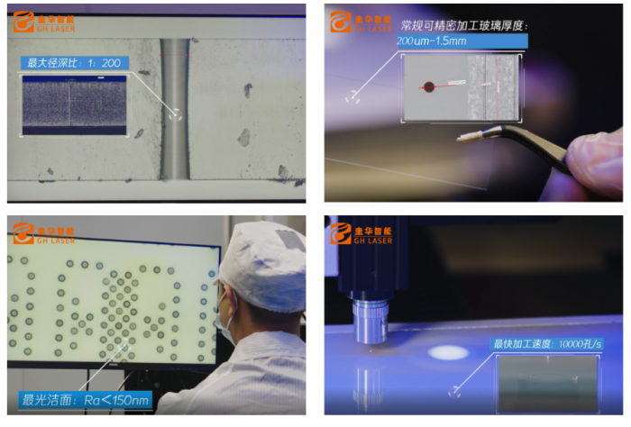 可實(shí)現(xiàn)1:200的超大徑深比,孔壁光潔度精準(zhǔn)控制在150nm以內(nèi),加工效率高達(dá)10000孔/秒,在常規(guī)工況下,能對厚度為200μm至1.5mm的玻璃開展高精度精密加工。