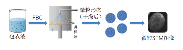 流化床涂層技術指的是在氣流作用下將固體芯材懸浮在空中,然后將涂層材料(壁材)重復噴涂到芯材上,溶劑蒸發后形成固體顆粒的過程。FBC技術要求壁材必須具有一定的黏度、熱穩定性和成膜能力,從而能夠實現霧化和泵送,并能夠在顆粒表面上形成適當的膜。FBC工藝雖然不是在低溫條件下進行,但其所需溫度遠遠低于SD技術,因此適用于熱不穩定物質的粉體穩態化。