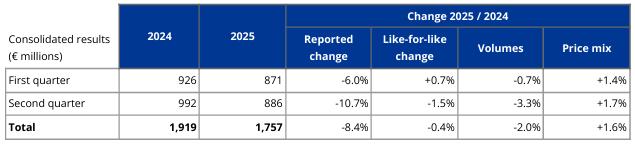 2025年上半年歸屬于集團股東的凈利潤為7000萬歐元,去年同期為1.42億歐元,這反映了當前凈利潤的下降。2025年上半年凈當前自由經營現金流總額為4,000萬歐元,剔除戰略性資本支出后,預計將低于2.7億歐元,低于2024年的2.91億歐元。