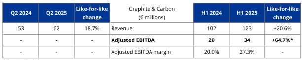 2025年上半年,石墨和碳業務實現收入1.23億歐元,第二季度確認了全年良好的開端。銷售增長主要得益于強勁的終端市場,尤其是電動汽車和導電聚合物、市場份額的提升以及新產品的推出。