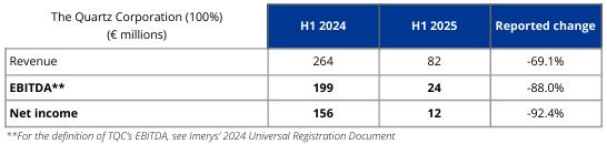 石英公司(高純石英合資企業,Imerys持有50%股權)實現收入8200萬歐元(按100%計算),較去年異常的上半年下降69.1%。業績仍受太陽能價值鏈極度擾動的影響,庫存持續高位,即使第二季度活動逐步改善,凈利潤依舊大幅下滑至1200萬歐元。