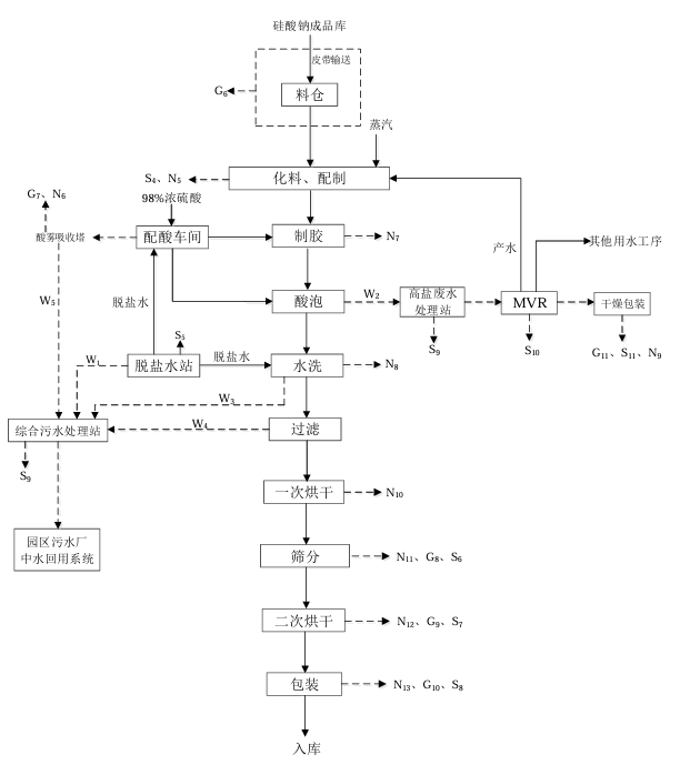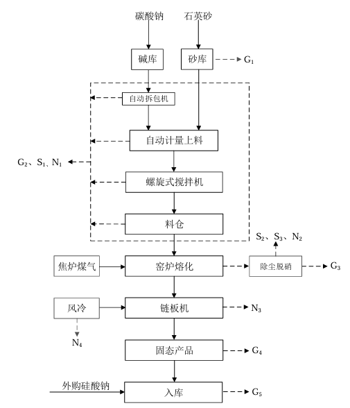 該項目產(chǎn)品的主要生產(chǎn)工藝分為兩步:第一步是生產(chǎn)硅酸鈉,硅酸鈉的生產(chǎn)方法包括干法和濕法工藝,干法工藝一般以石英砂和純堿為原料,通過配比進(jìn)入馬蹄焰爐,在高溫條件下形成熔融狀態(tài)硅酸鈉,后經(jīng)冷卻形成固體產(chǎn)品;濕法工藝以液體苛性鈉和石英砂為原料,按適當(dāng)比例混合加入壓熱釜內(nèi),用蒸汽加熱并進(jìn)行攪拌,使之直接反應(yīng)而成液體硅酸鈉,經(jīng)過濾、濃縮制得成品。該項目硅酸鈉采用干法工藝。
