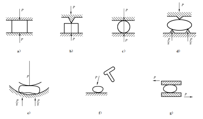 a)擠壓破碎;b)、c)劈裂破碎;d)、e)剪切破碎;f)沖擊破碎;g)研磨磨碎