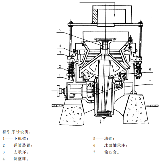 彈簧圓錐破碎機:架體周邊裝有若干組彈簧,承受破碎機工作的破碎力,保護破碎機不被破壞的保險裝置的圓錐破碎機。