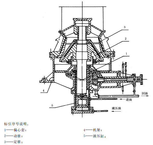 有普通型和液壓型兩種型式。普通型的動錐主軸鉸鏈懸掛在橫梁上;液壓型是利用液壓裝置實現自動調整排礦口和過鐵保護,其動錐主軸用機體下端的液壓缸支承。
