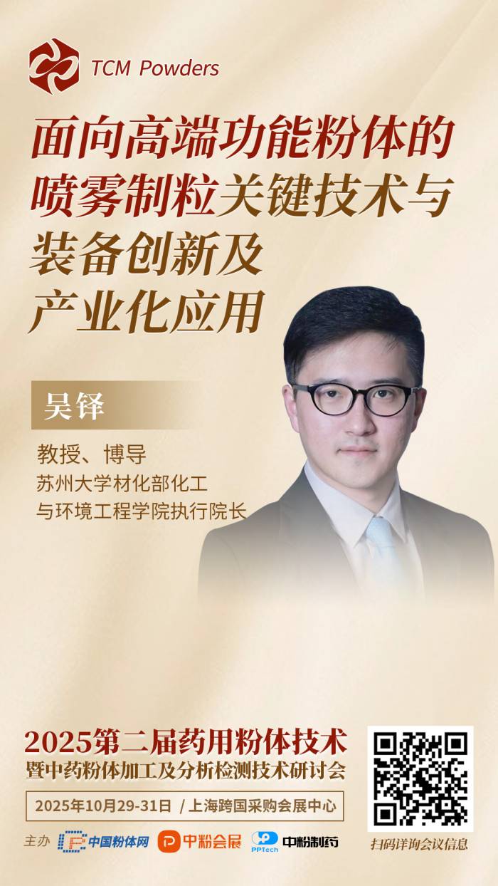 聚焦“從粉體技術、論中藥工藝”為主題,10月29-31日,中國粉體網將于2025IPIE上海高端粉體裝備與科學儀器展覽會期間,同期舉辦“2025第二屆藥用粉體技術暨中藥粉體加工及分析檢測技術研討會”,屆時來自蘇州大學吳鐸教授將為大家帶來《面向高端功能粉體的噴霧制粒關鍵技術與裝備創新及產業化應用》的主題報告。報告主講人將介紹自主研發的面向高端功能粉體的噴霧制粒裝備技術平臺,以“經口吸入粉霧劑”和“鼻用粉霧劑”為應用導向,結合基礎理論研究及產品應用開發案例分析,針對顆粒尺寸、形貌、密度、晶型、表面組成等關鍵結構屬性,目標闡明前驅液配方和技術工藝參數對顆粒微納結構的影響機理和調控機制,并解析顆粒結構屬性與其流動性、存儲穩定性、肺部及鼻腔宏觀遞送性能等關鍵質量屬性間的構效關系。