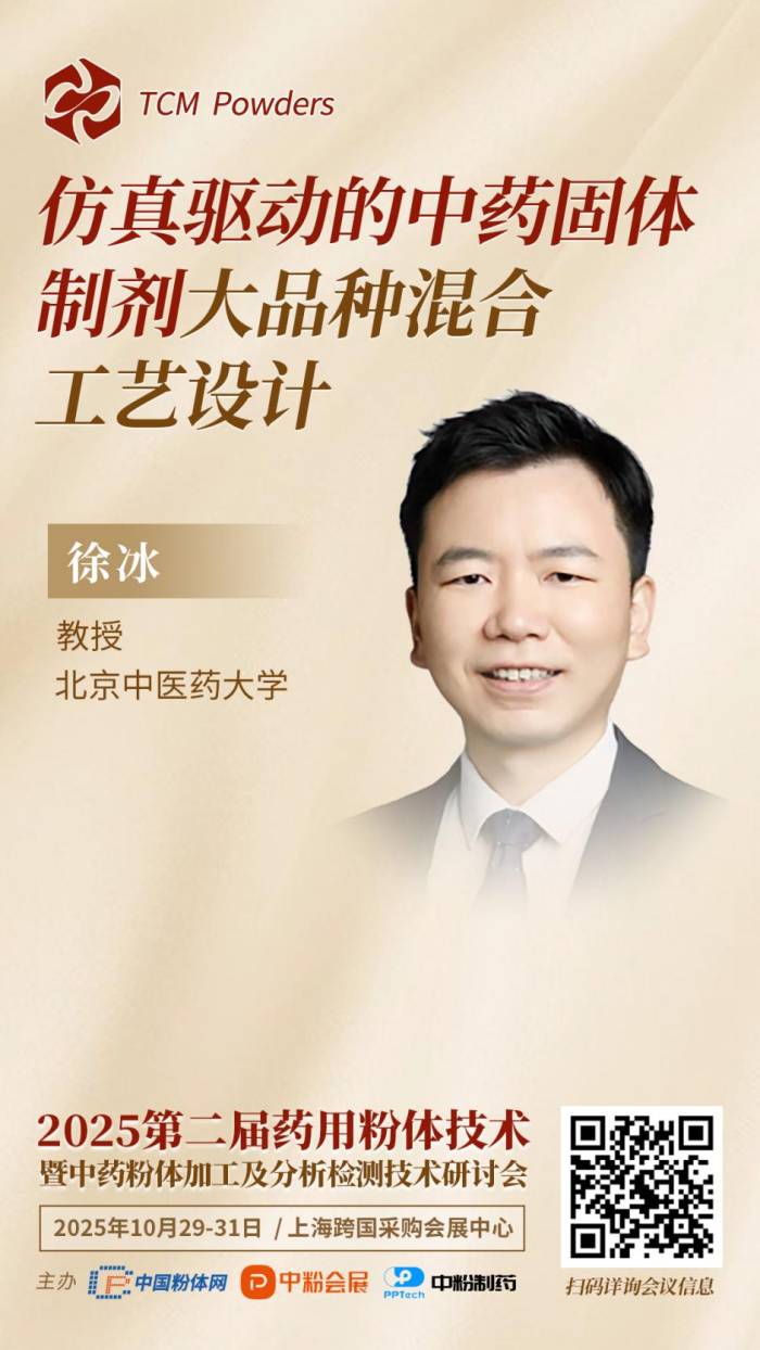 聚焦“從粉體技術、論中藥工藝”為主題,10月29-31日,中國粉體網將于2025IPIE上海高端粉體裝備與科學儀器展覽會期間,同期舉辦“2025第二屆藥用粉體技術暨中藥粉體加工及分析檢測技術研討會”,屆時北京中醫藥大學徐冰教授將為大家帶來《仿真驅動的中藥固體制劑大品種混合工藝設計》的主題報告。